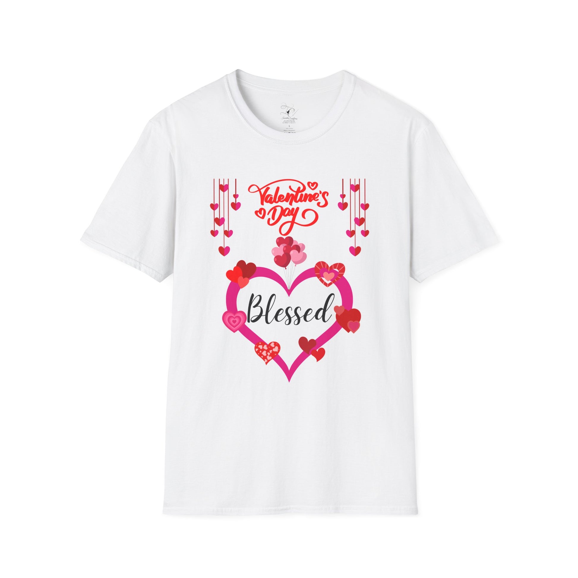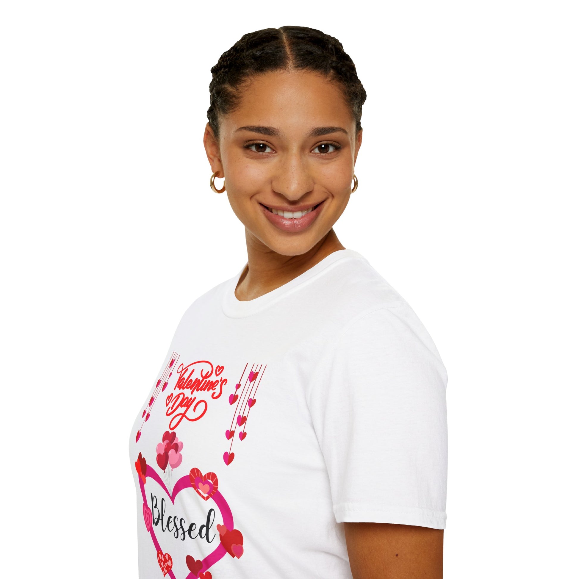 Lightweight and soft, this crew-neck tee carries a warm, heartfelt vibe. A hand-drawn heart wreath of roses, ribbons and dangling hearts frames the word “Blessed,” while a flowing “Valentine’s Day” script sits above — playful, sincere, and quietly devotional. The breathable 100% ring‑spun cotton feels gentle against skin; the tubular knit body and shoulder tape keep the shape morning after wash. Wear it to slow mornings with coffee, to low-key family dinners, or as a cozy layer for a neighborhood stroll. It reads like a small celebration — faith, love, gratitude — without shouting. Subtle tear‑away label and a resilient ribbed collar make it comfortable all day and easy to love.